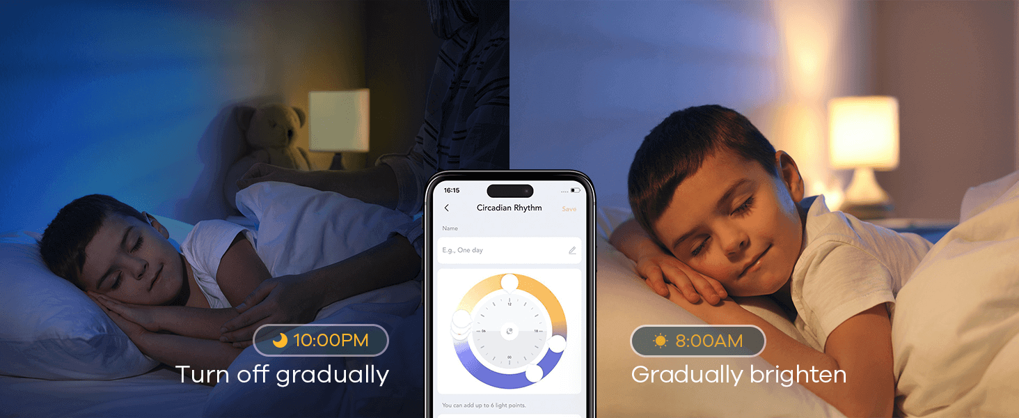 - 【Wake-Up Mode】The light bulb changes colors auto in 24H, simulating the sun, For example: from dusk to dawn, the color of the Matter light bulb gradually changes to a bright and warm. Linkind smart light bulbs help you to take care of the elderly and children, and have a comfortable sleep. You can also set the Matter smart bulb according to your schedule and control it remotely.