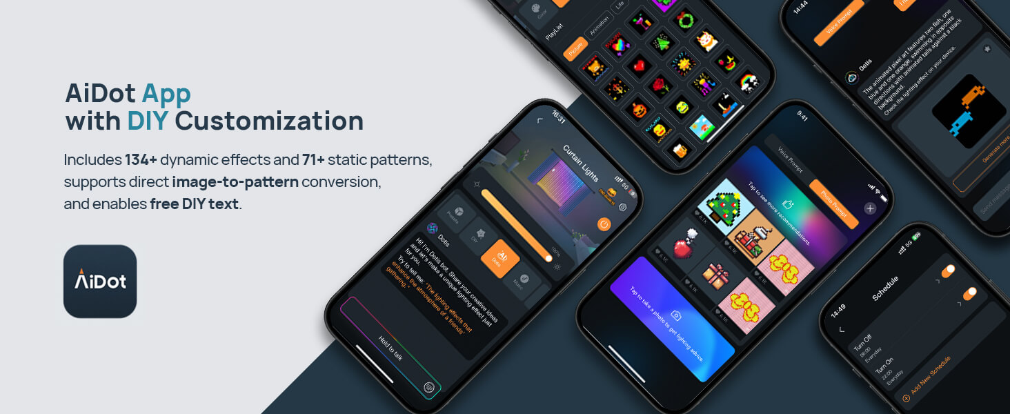 - [Personalized DIY Creation Mode] Unleash your creativity with the AiDot app's DIY mode. Customize each light's color and effect individually—spell names, design gradients, or animate intricate patterns. It's a fantastic activity to create playful holiday LED curtain lights with your kids, perfect for decorating their bedroom windows as a Christmas gift.