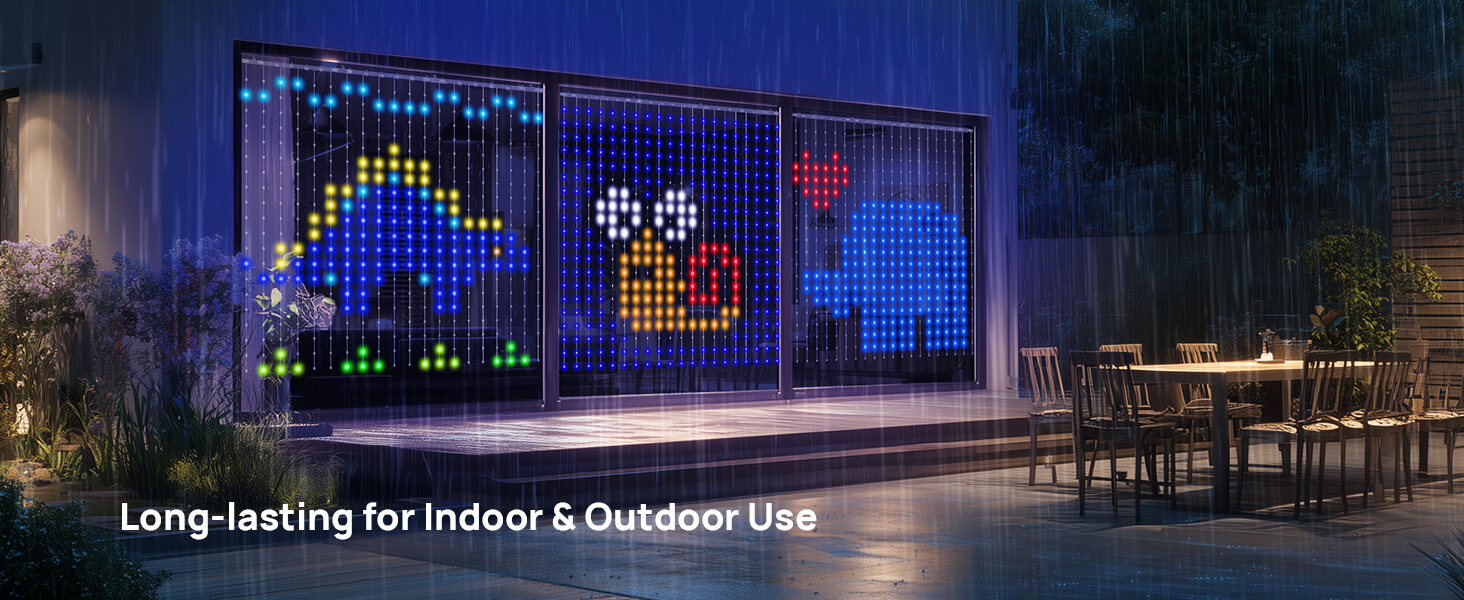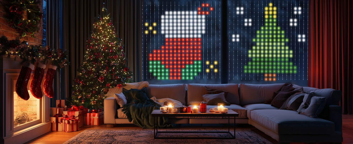 - [Clear GIF, Text & Image Display] Featuring 400 LEDs arranged in a 20×20 pixel grid, these LED curtain lights indoor deliver crisp displays of uploaded GIFs, text, and custom images. Perfect smart Christmas curtain lights for bedroom to create a cozy ambiance or enlivening family gatherings with dynamic lighting.