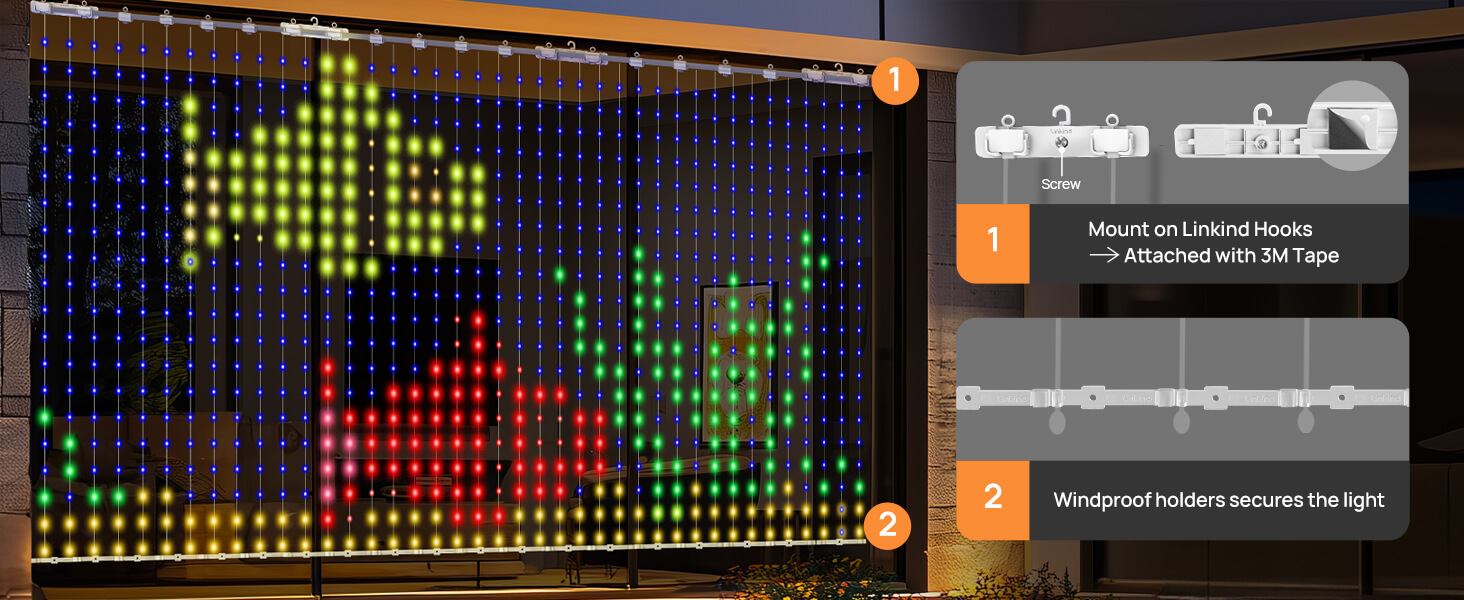 - [IP65 Waterproof & Easy Installation] Designed for indoor and outdoor use, these lights feature an IP65 waterproof rating. They include unique hooks, 3M tape, and windproof holders for tool-free setup and removal—rain or shine. Easily transition them from a child's bedroom to a garage door display, ensuring durability and versatility for any occasion.