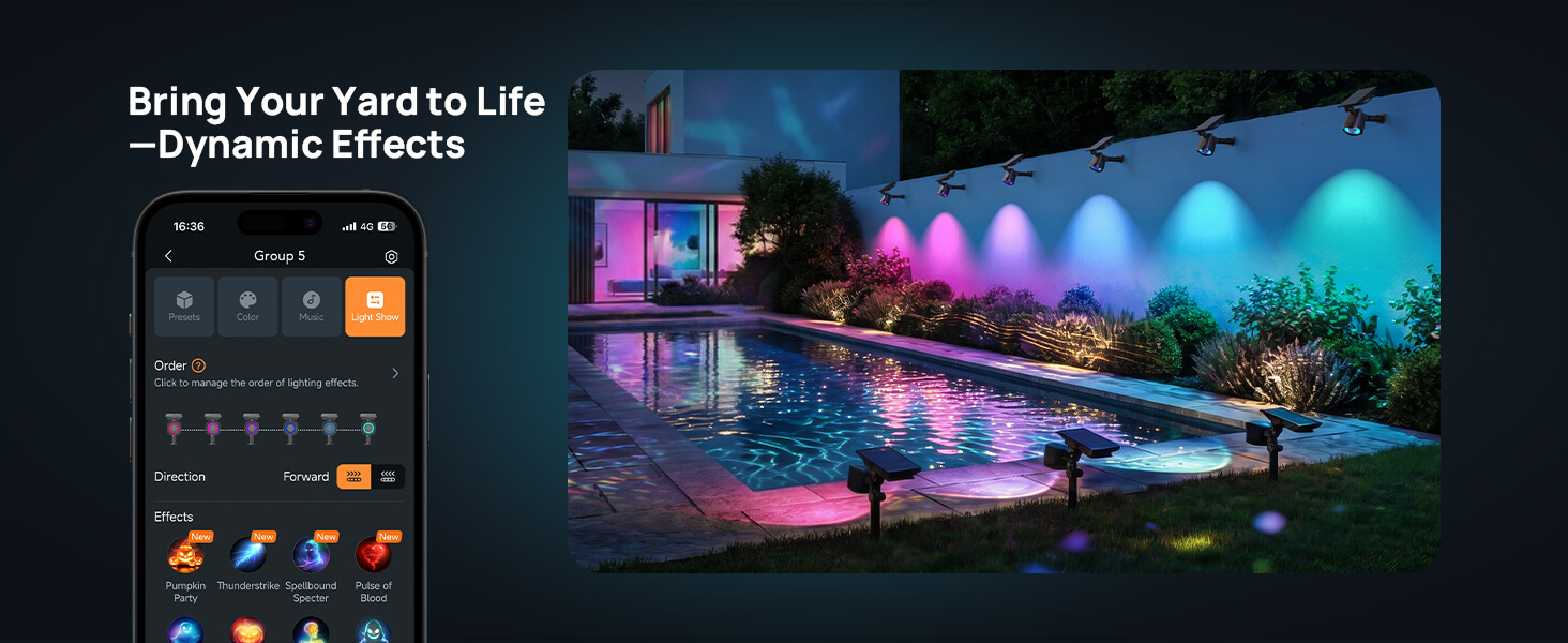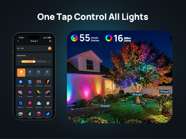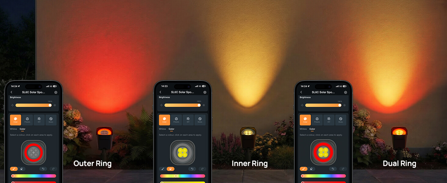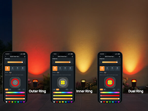 The Linkind Smart Solar Lights Outdoor SL6C features a dual-ring design with two different beam patterns: Inner ring: 32° focused spot beam for accent lighting Outer ring: 82° wide flood beam for broader area coverage While the product specifications don't specify an exact distance in feet, the 32° inner beam is designed for targeted accent lighting of trees and specific features, while the 82° outer beam provides wide, even coverage for yards and landscaping areas.