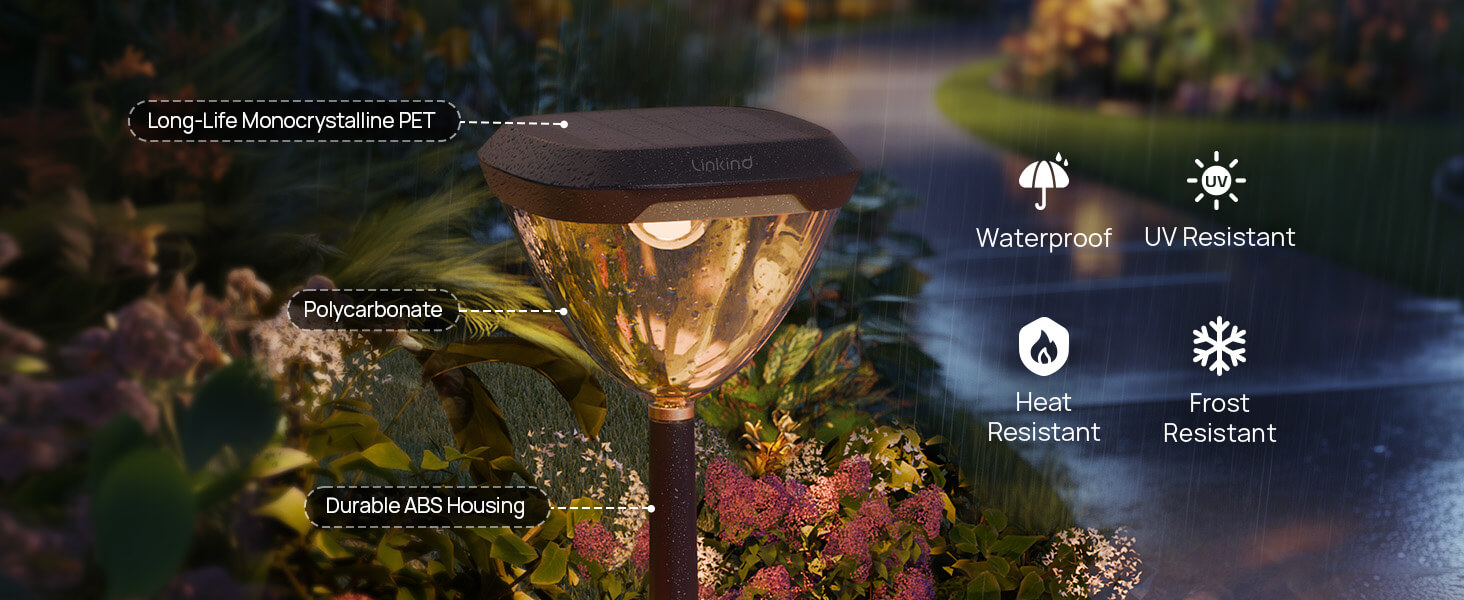 • 【Weather-Resistant and Effortless Setup】Durable all-weather solar lights outdoor waterproof with thickened ABS construction and efficient solar panels withstand extreme heat, cold, and winds. Reinforced stakes secure firmly in hard soil with wire-free instant installation