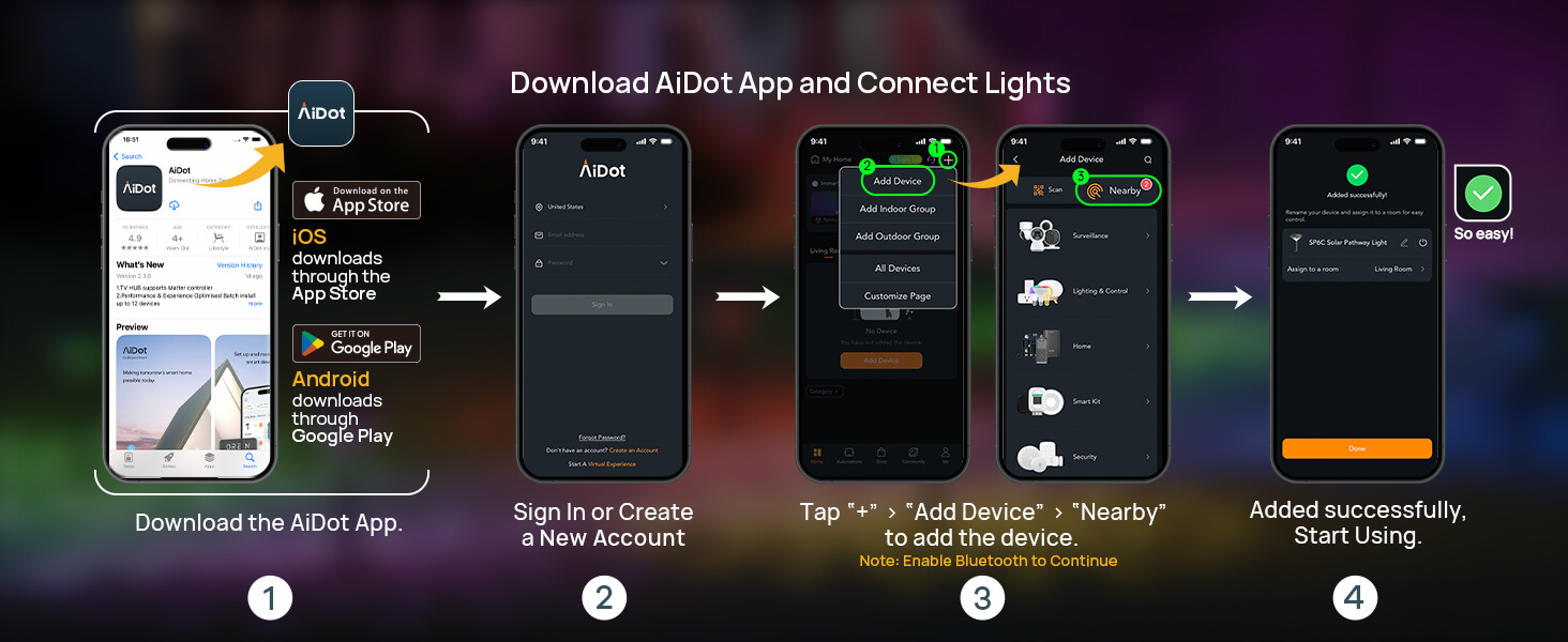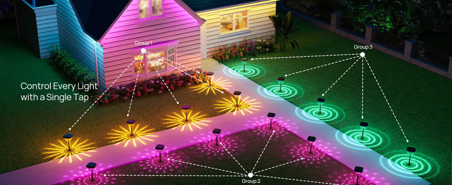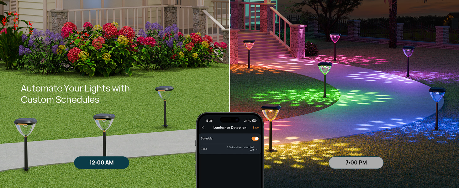 • 【Smart Control and Schedule】Effortlessly manage your solar garden lights via the AiDot app. You could enjoy auto dusk-to-dawn landscape lighting or create a fully personalized schedule whether for evening gatherings or early morning walks.