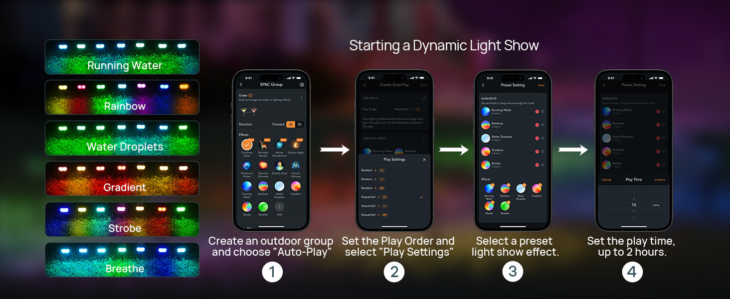 • 【Light Shows and Group Control 】Create dazzling light shows with up to 8 groups (32 lights each) ! Enjoy running water, rainbows, breathing effects for daily use, plus Halloween & Christmas themes. Sync or mix themes across groups, or DIY custom colors/rhythms for endless lighting magic!