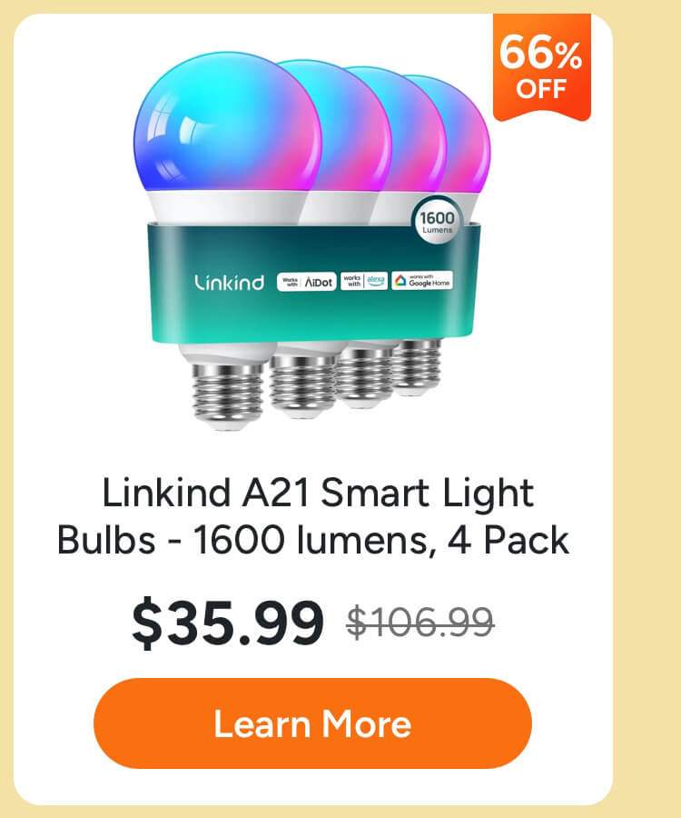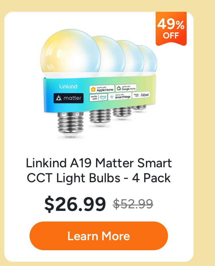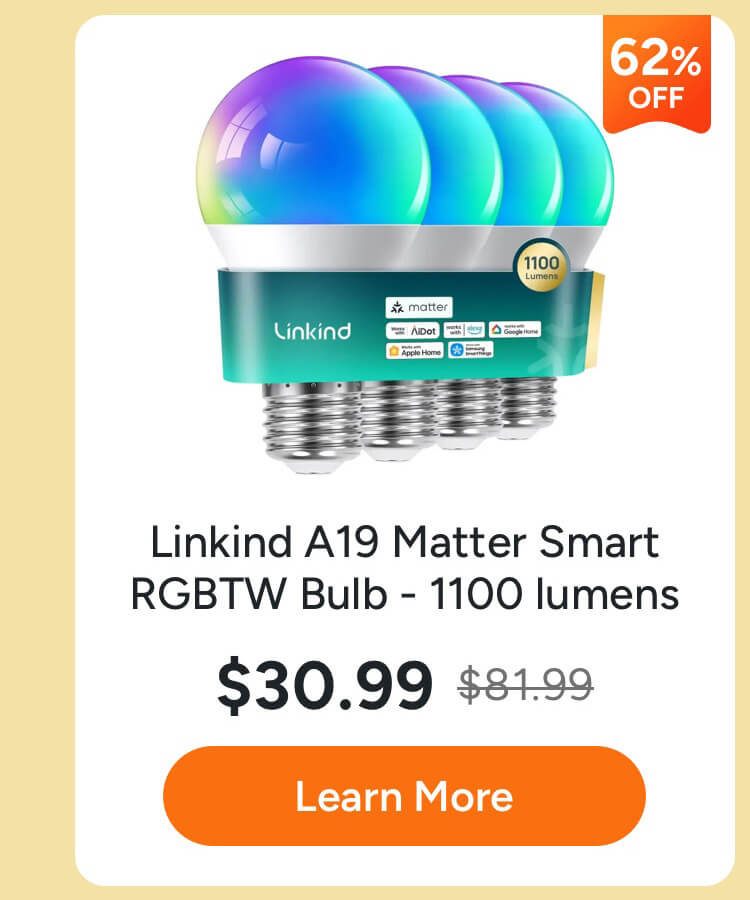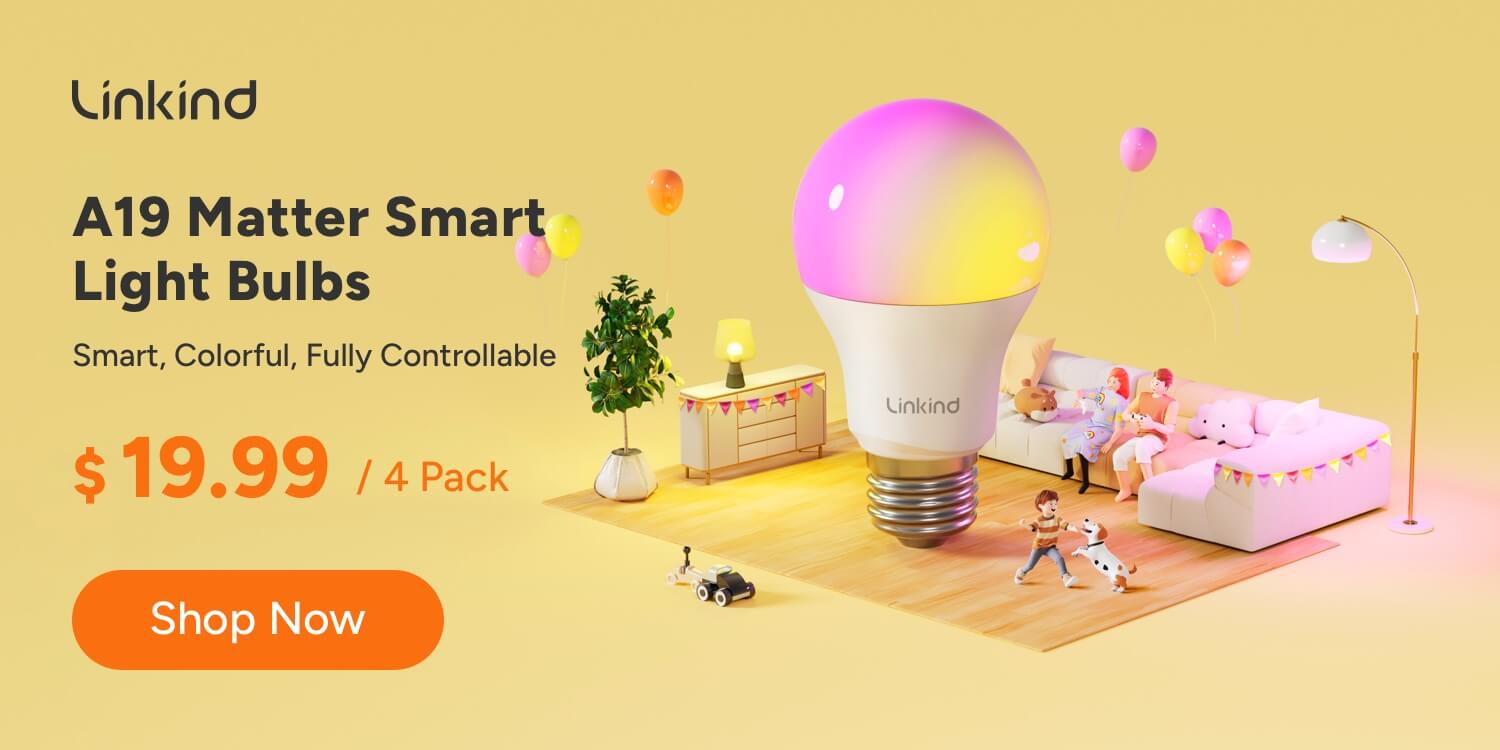 • Linkind Matter WiFi Smart Light Bulbs, Smart Bulb Work with Apple Home, Alexa, Google Home, SmartThings,A19 E26 60W 800LM -4 Pack