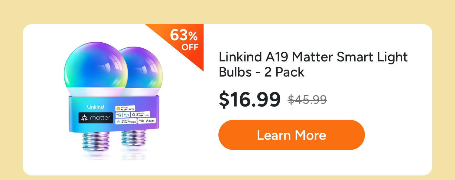 • Linkind Matter WiFi Smart Light Bulbs, Smart Bulb Work with Apple Home, Alexa, Google Home, SmartThings, A19 E26 60W 800LM