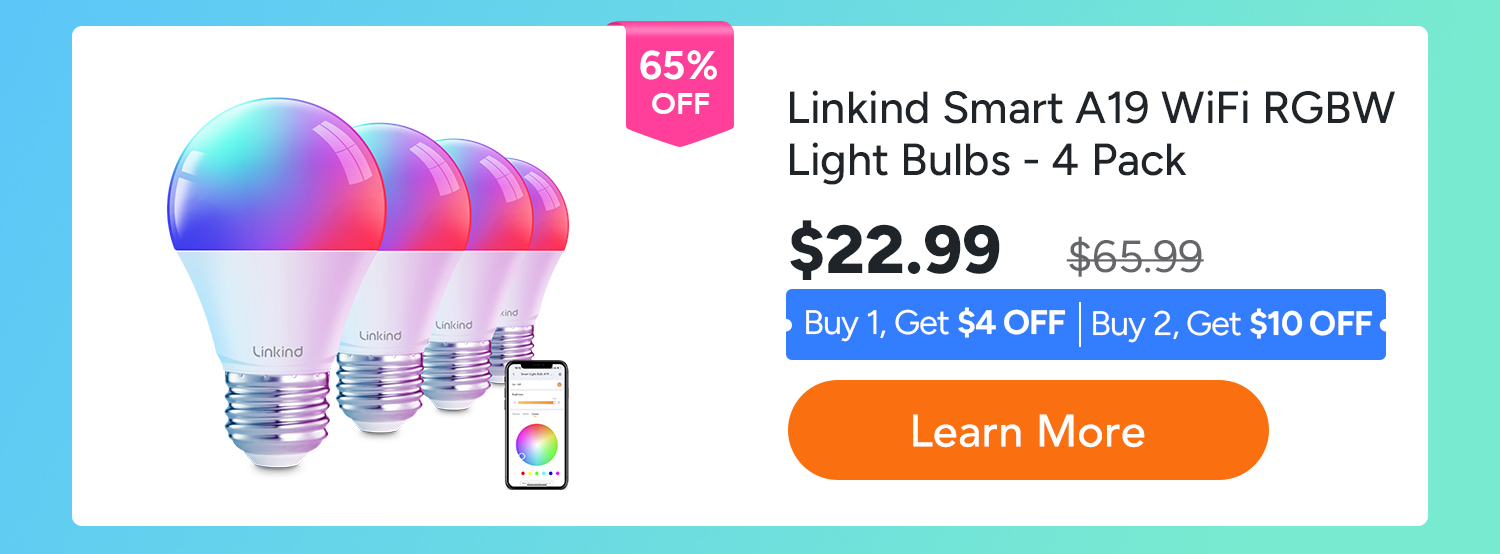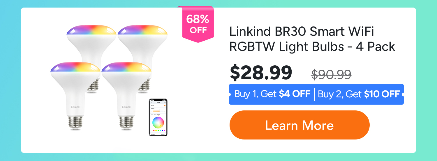 • Linkind BR30 Smart WiFi Flood RGBTW Color Changing Light Bulbs, RGBTW Color Changing Light Bulb, 1800K-6500K Tunable White - 4 Packs