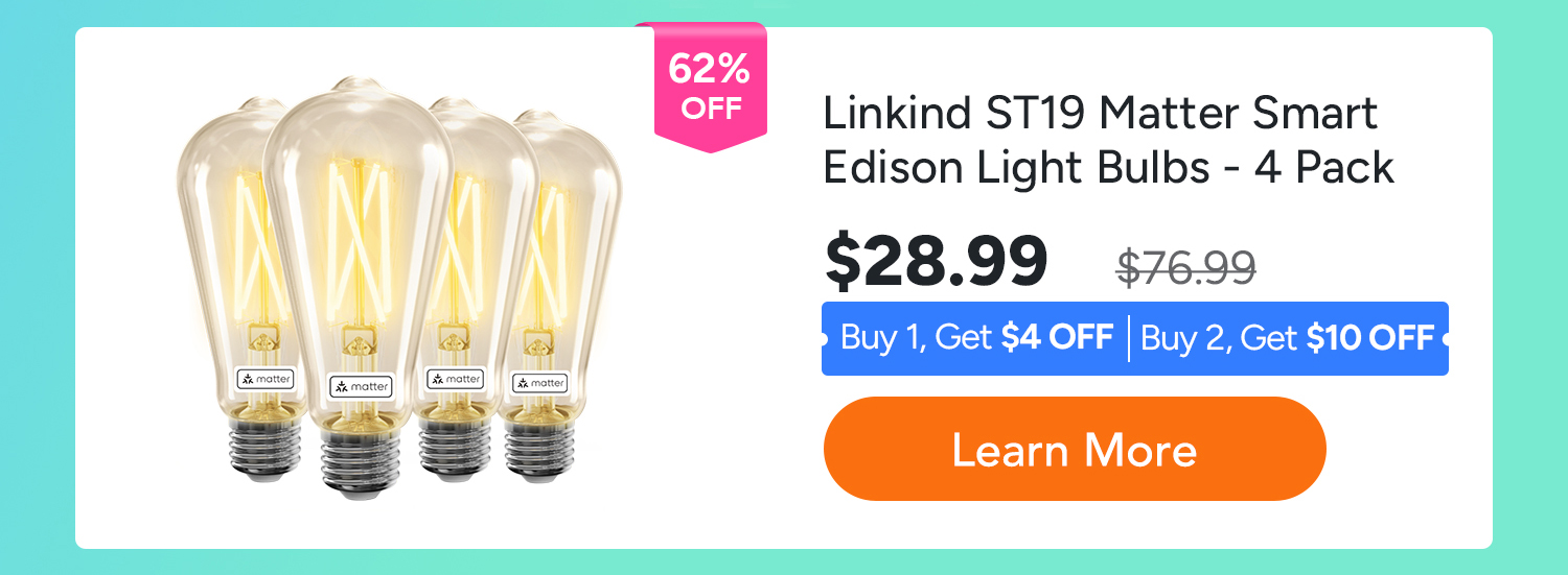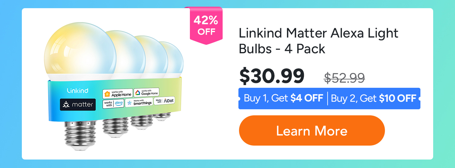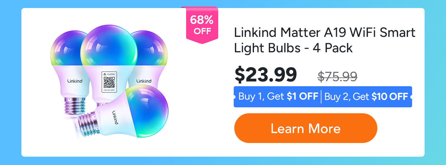 • Linkind Matter WiFi Smart Light Bulbs, Smart Bulb Work with Apple Home, Alexa, Google Home, SmartThings,A19 E26 60W 800LM -4 Pack