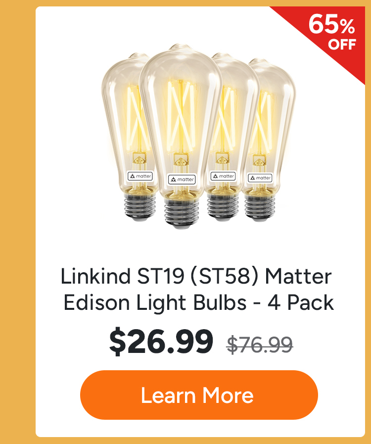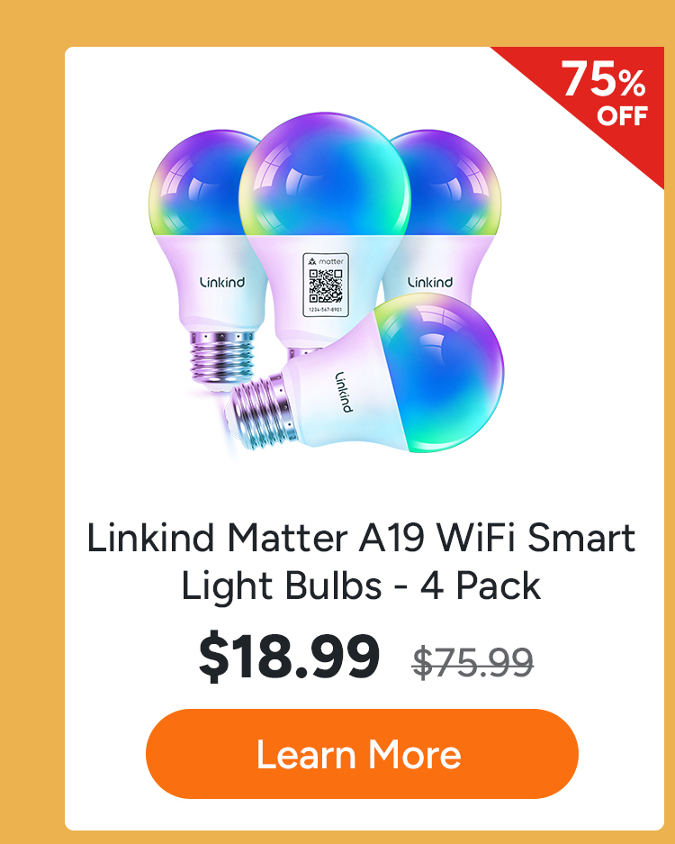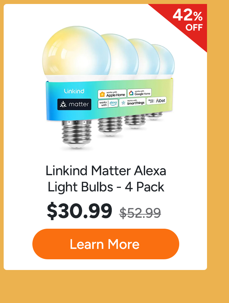 • Linkind Matter WiFi Smart Light Bulbs, Smart Bulb Work with Apple Home, Alexa, Google Home, SmartThings,A19 E26 60W 800LM -4 Pack
