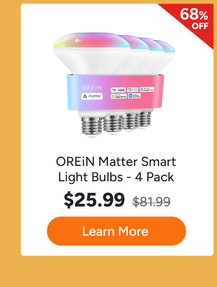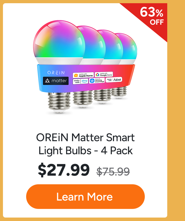 • OREiN Matter Smart Light Bulbs, Work with Apple Home, Alexa, Google Home, SmartThings, Led Bulbs 650 Lumens Equivalent 60W 4Pack