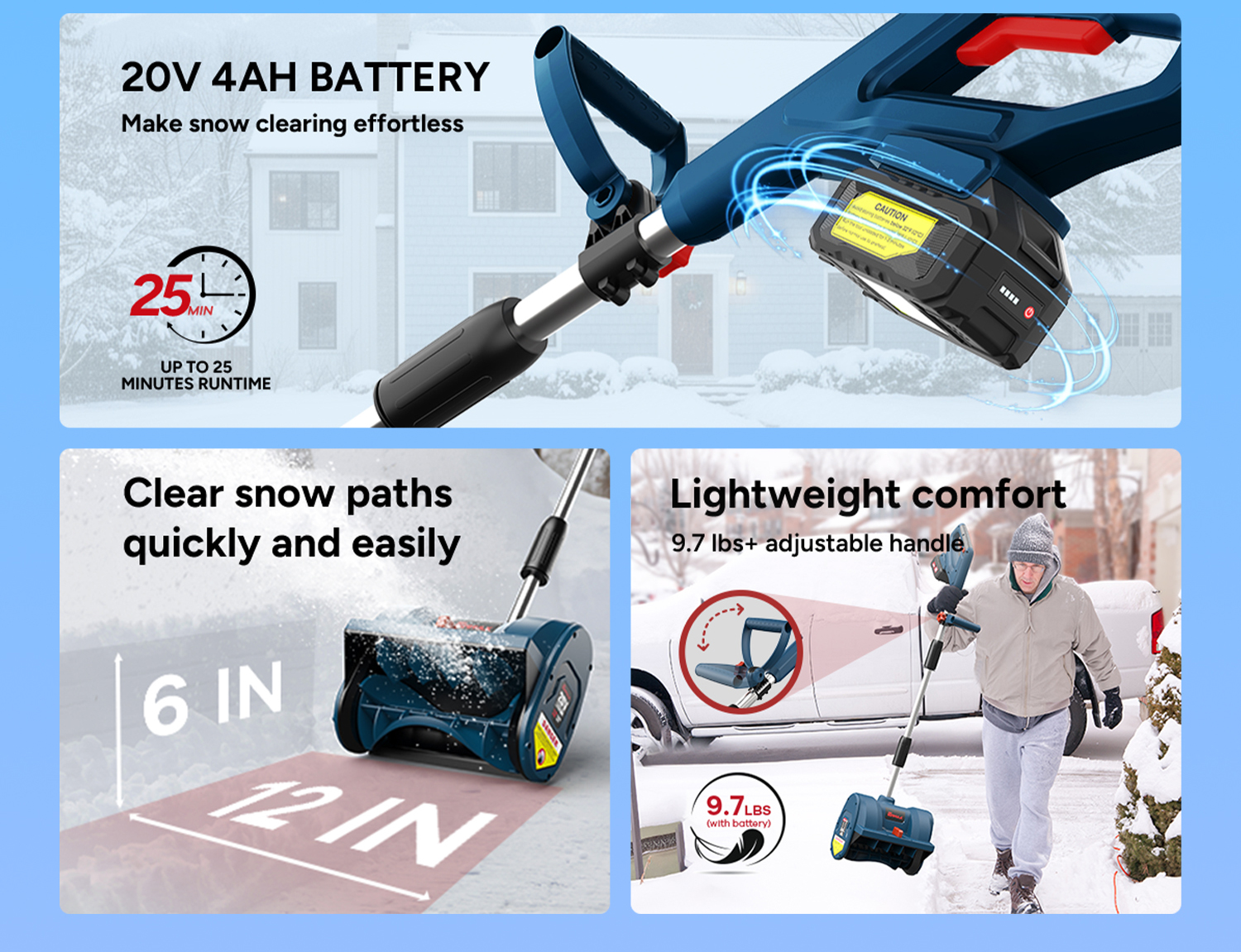 • ENHULK 12in. Cordless Electric Snow Shovel, 20V Power with 4Ah Battery Included, Battery Snow Blower with Directional Plate & Adjustable Front Handle