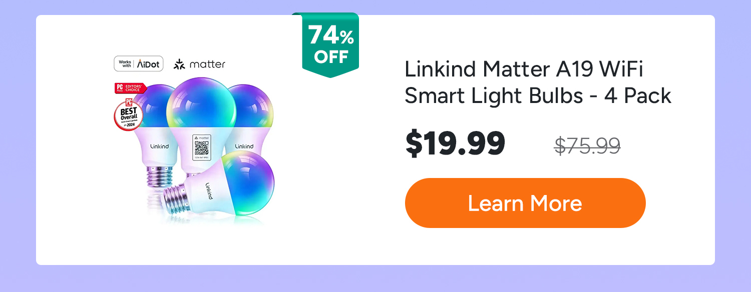 • Linkind Matter WiFi Smart Light Bulbs, Smart Bulb Work with Apple Home, Alexa, Google Home, SmartThings,A19 E26 60W 800LM -4 Pack